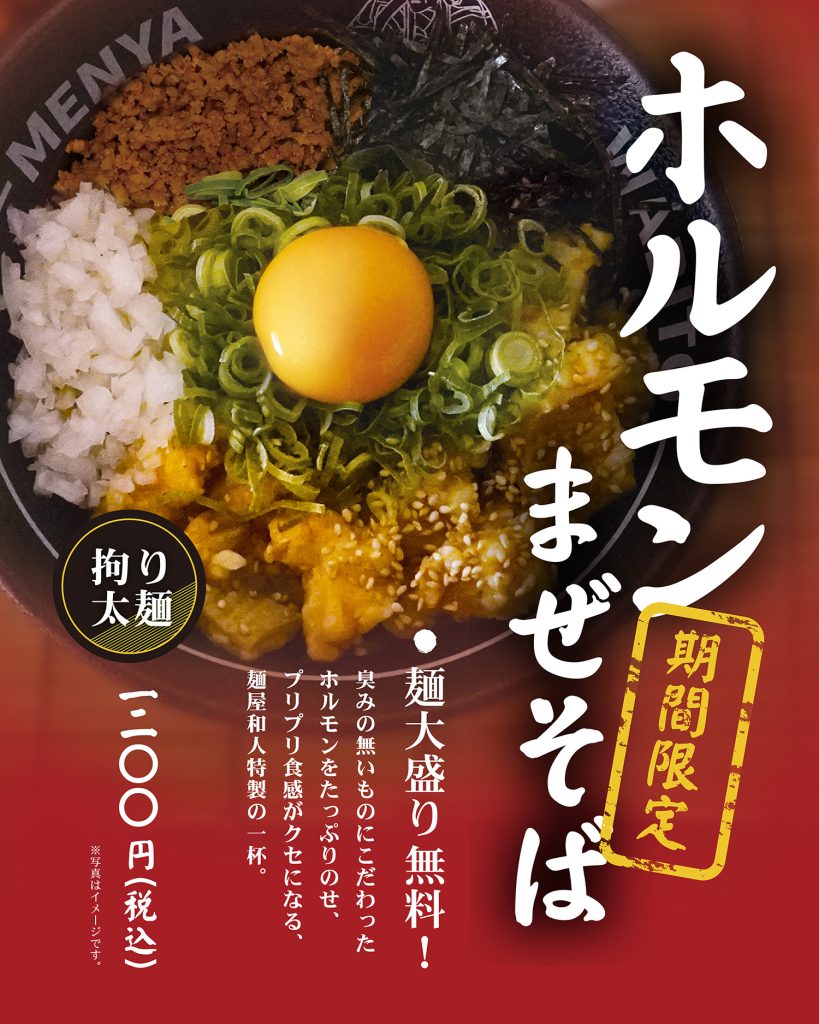 ホルモンまぜそば販売開始🔥 毎年人気のホルモンまぜそばの販売が今年もスタートしました! 臭みの無いホルモンを使用した店長こだわりのホルモンまぜそば。 プリプリ食感のあっさりホルモンと、味のしっかりしたまぜそばの具材が絶妙なバランスでとっても美味しい […] ホルモンまぜそば販売開始🔥 続きを読む »